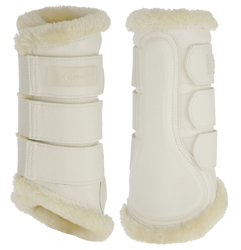 Elülső lábszárvédők anatómiai szabással, tartós műbőrből, tépőzáras rögzítéssel és puha műszőrmével belül.• műbőr