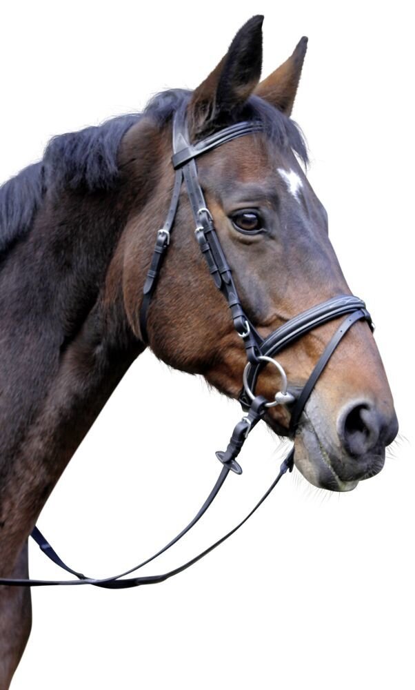 Klasická anglická uzdečka s kombinovaným nánosníkem, měkce podloženou čelenkou, nátylníkem a nánosníkem.Čelenka i nánosník jsou dekorativně prošity bílou nití.