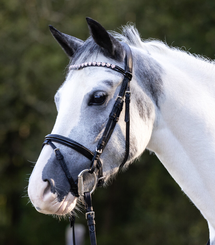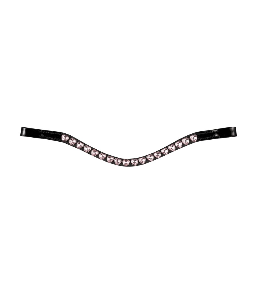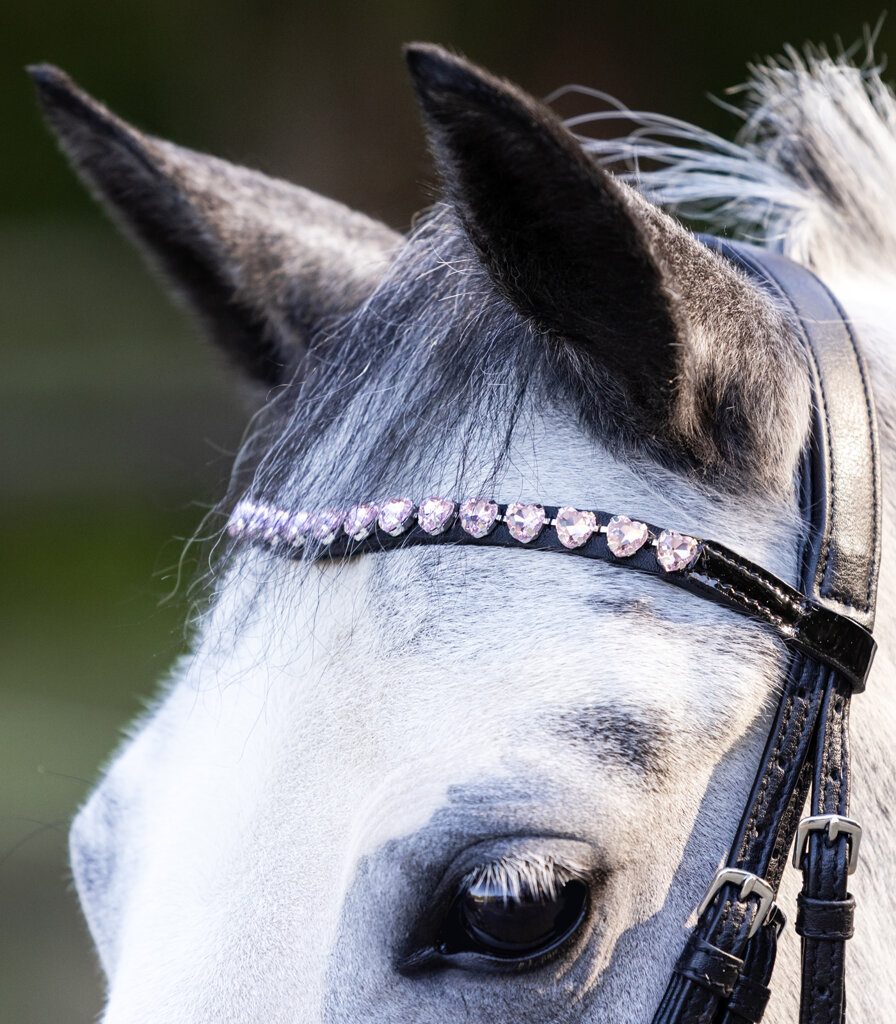 Elegantní uzdečka pro pony Happy Hearts z odolného syntetického materiálu kombinuje praktičnost s hravými detaily. Rovný nátylník a anglický nánosník z imitace lakované kůže působí moderně, zatímco čelenka s lesklým lemem a růžovými srdíčky dodává jemný nádech originality.