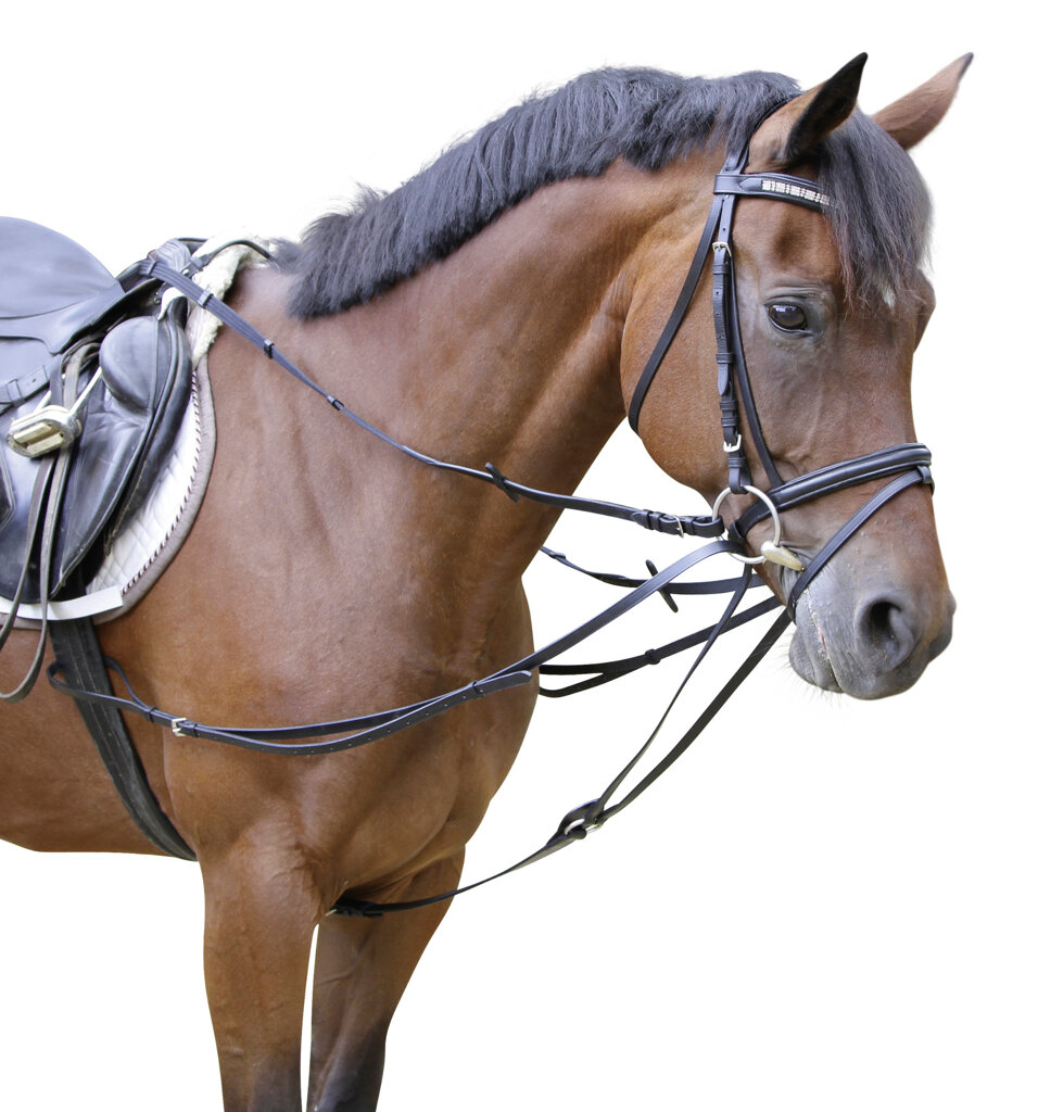 Kožené boční, trojúhelníkové vyvazovací otěže ukazují koni cestu dopředu a dolů.• kůže