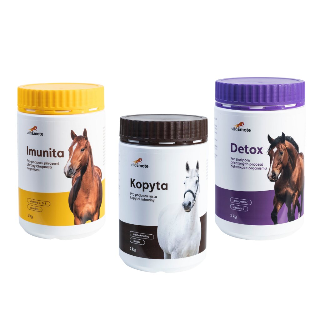 Tato sada VitaEmote – Dospělí koně 3 je určena pro cílenou péči o zdraví kopyt, imunitní systém a celkovou kondici koně. Kombinuje tři prémiové doplňky, které dohromady podporují nejen pevná a zdravá kopyta, ale i odolnost organismu a správnou funkci metabolismu.