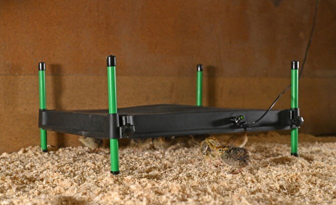 Mláďata se vylíhnou a odpočívají v útulném teple pod deskou. Deska vyzařuje teplo směrem dolů a vytváří také akumulaci tepla.
