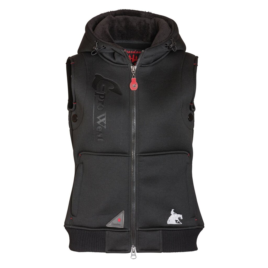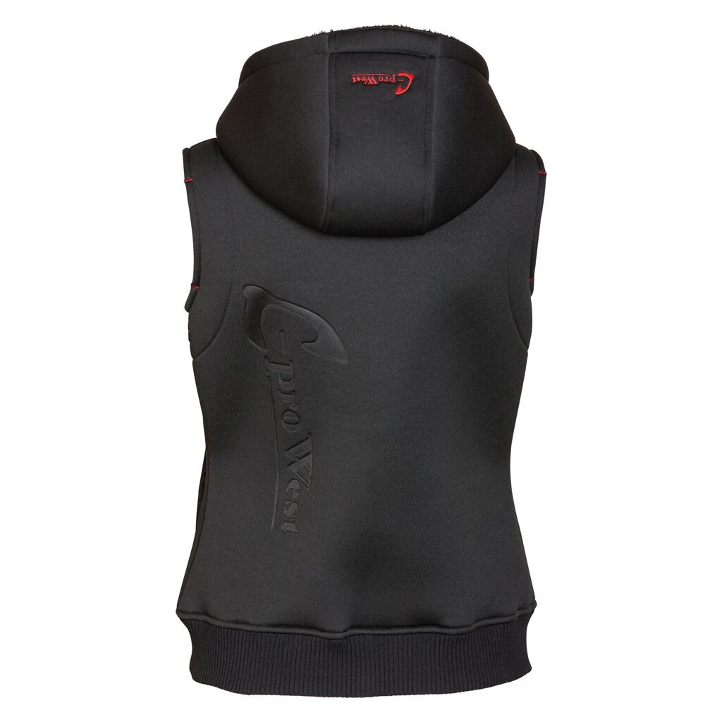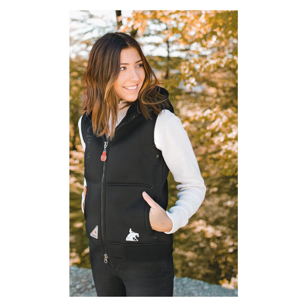 Odolná neoprenová jezdecká vesta a vesta pro volný čas L-pro West s funkčními detaily jako obousměrný zip, zateplená kapuce teddy fleecem a možnost stažení, úpletové lemy, 2 kapsy se zapínáním na zip. Celek dotváří plastický termotisk na právé a zadní straně vesty.• odolná vesta