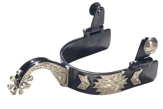 Westernové ostruhy s labutím krkem z černého kovu se stříbrným gravírovaným zdobením.