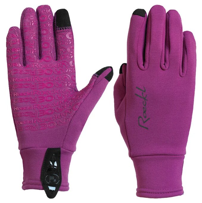 šestranný, extrémně pružný model rukavic ROECKL s úzkým střihem. Díky speciálnímu materiálu na palci a ukazováčku můžete přijmout hovor na svém chtrém telefonu aniž byste museli rukavici sundávat. Hřbet i dlaň rukavic jsou vyrobeny z měkkého, obzvlášť pružného materiálu Polartec® Power Stretch®Tento materiál zaručuje mimořádnou hřejivost. Na dlani je speciální silikonový potisk ve tvaru loga Roeckl, který zabraňuje proklouznutí otěže. Oblast mezi malíčkem a prsteníčkem je taktéž vyztužena silikonovým potiskem.